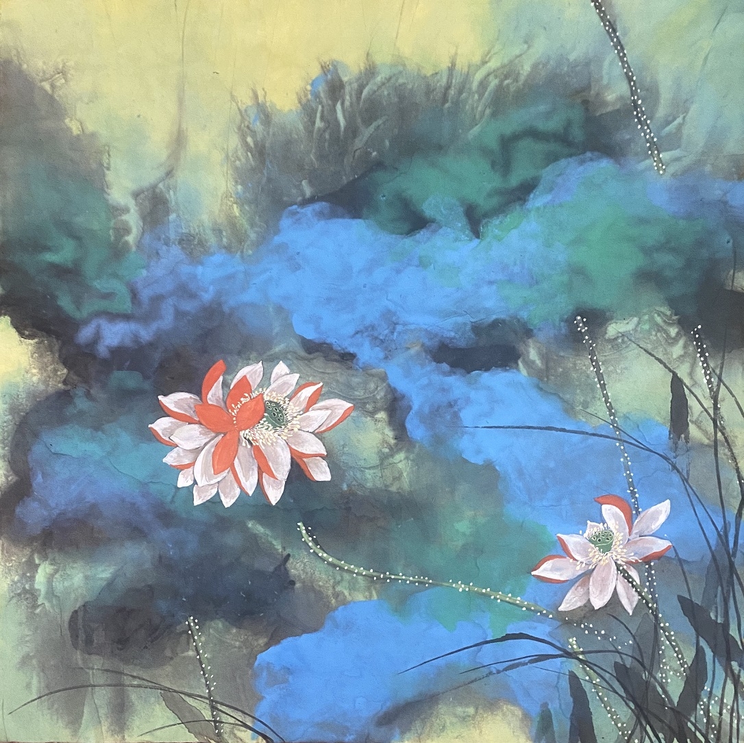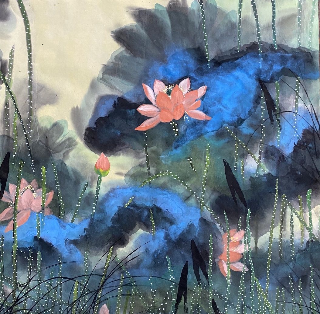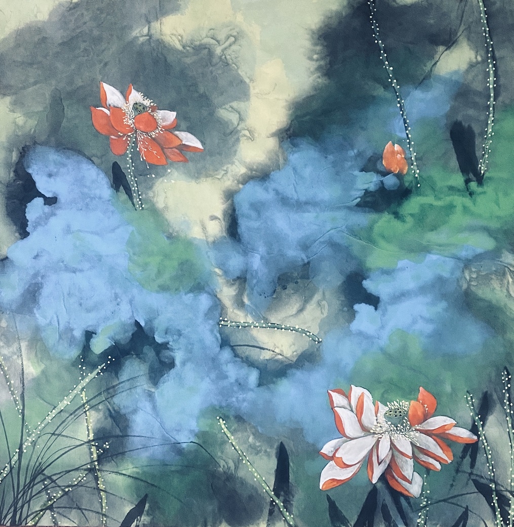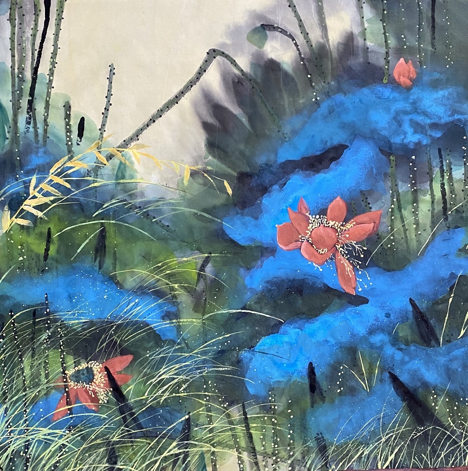 传统画法是他遂心应手的技法底色,对佛教的深谙研透是他可以复作净土变相的文化支撑。技法,可以让他的绘画利用建筑物、祥云、莲花的层层透视,结构出空间深广的体系,净土十方世界的意象,经由复杂丰富的画面结构组织,形成了可以自证而观的神圣奇迹,统摄人心自不必说,大振心颜正是观赏者的共同体验!
