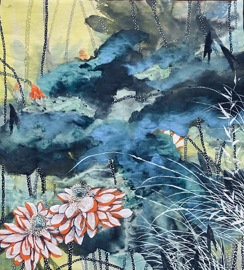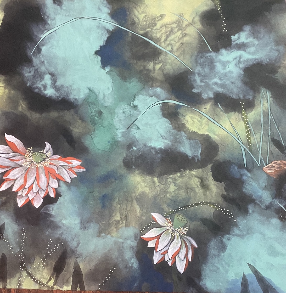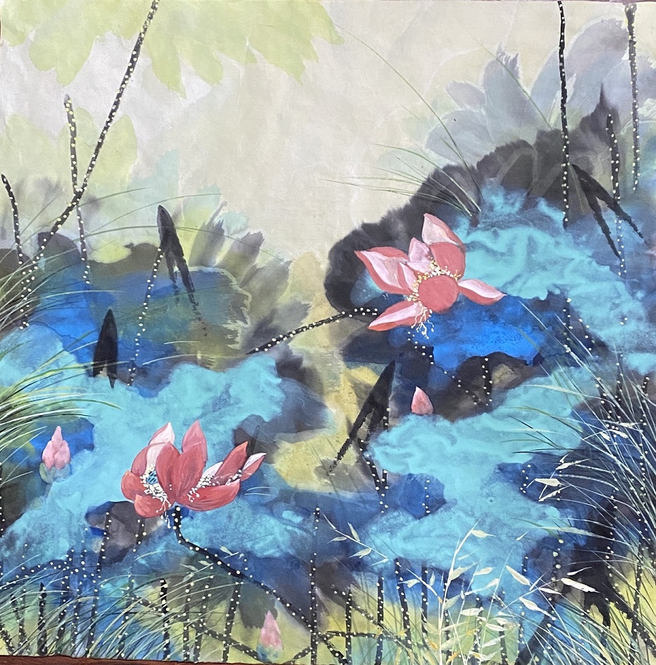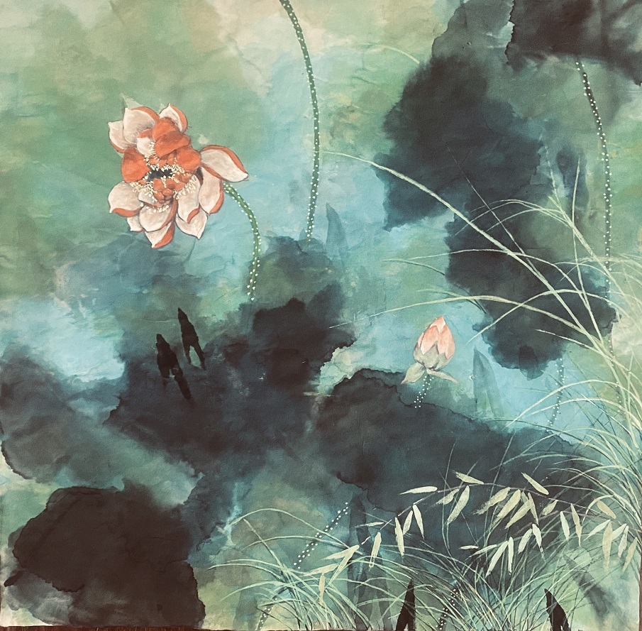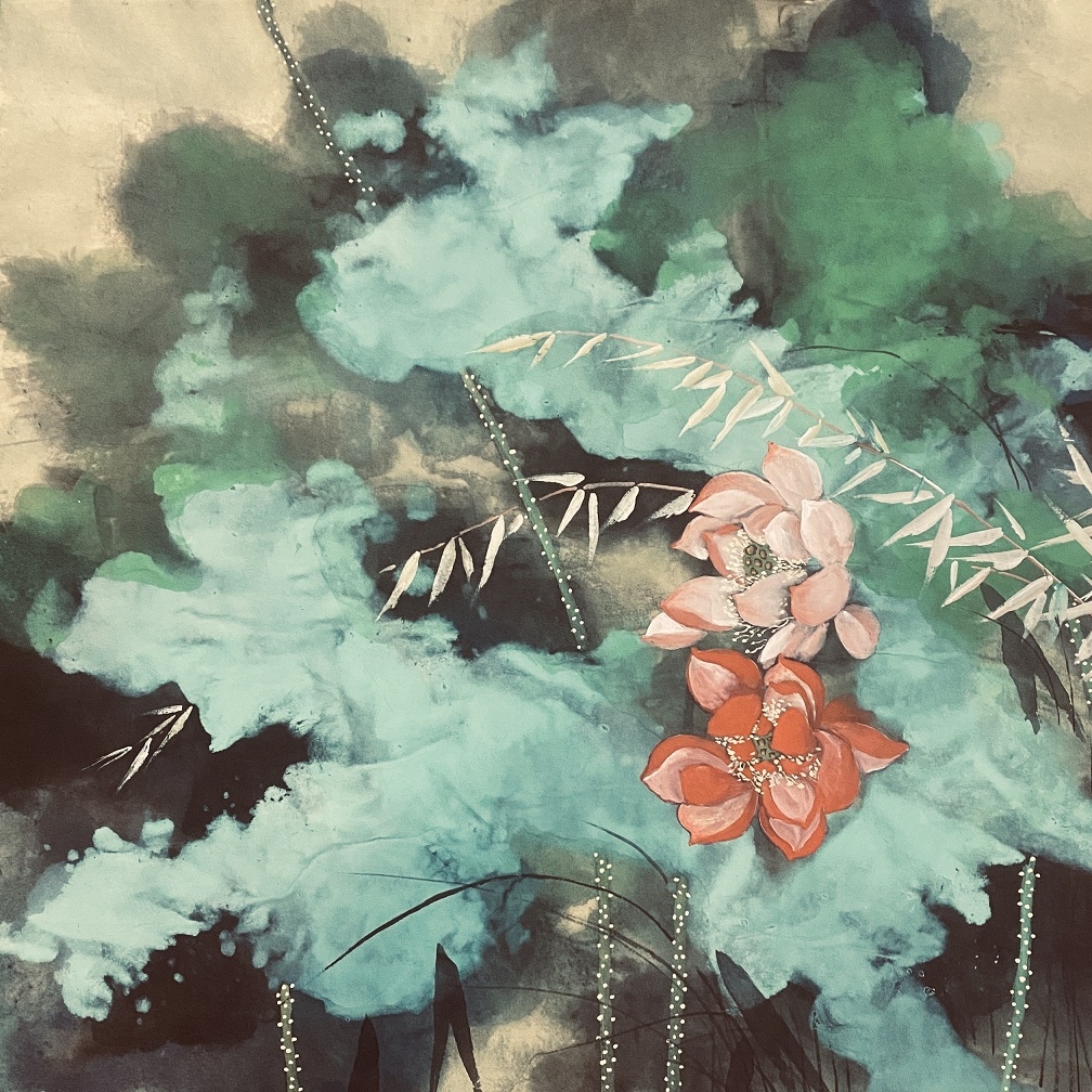 传统画法是他遂心应手的技法底色,对佛教的深谙研透是他可以复作净土变相的文化支撑。技法,可以让他的绘画利用建筑物、祥云、莲花的层层透视,结构出空间深广的体系,净土十方世界的意象,经由复杂丰富的画面结构组织,形成了可以自证而观的神圣奇迹,统摄人心自不必说,大振心颜正是观赏者的共同体验!